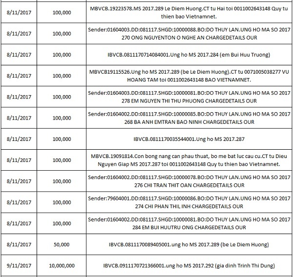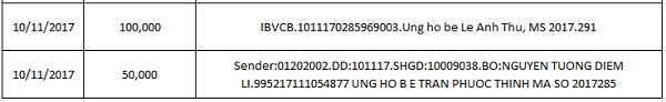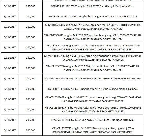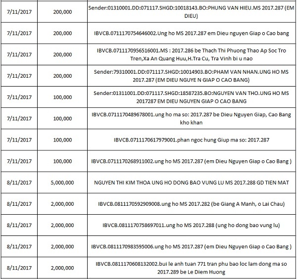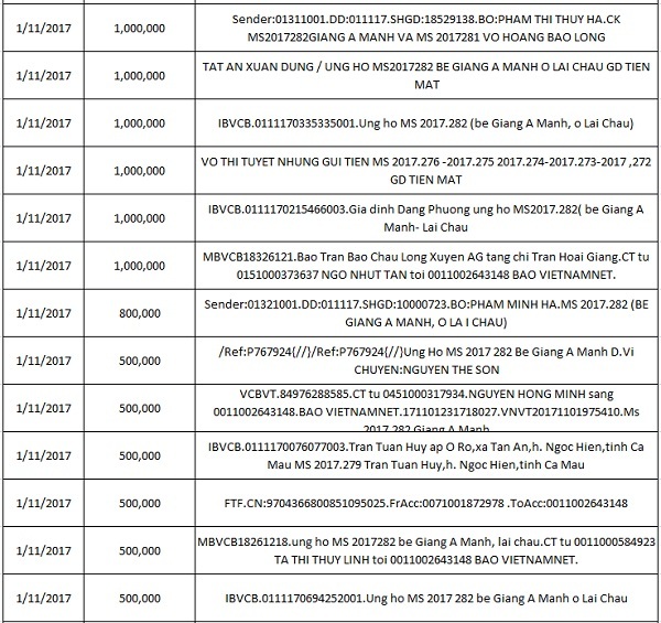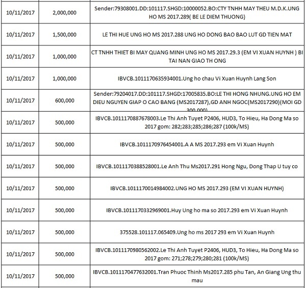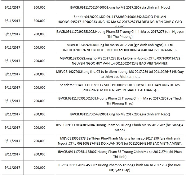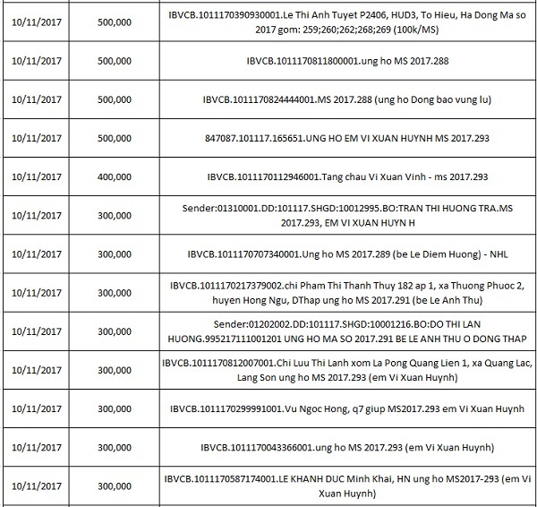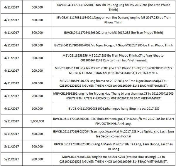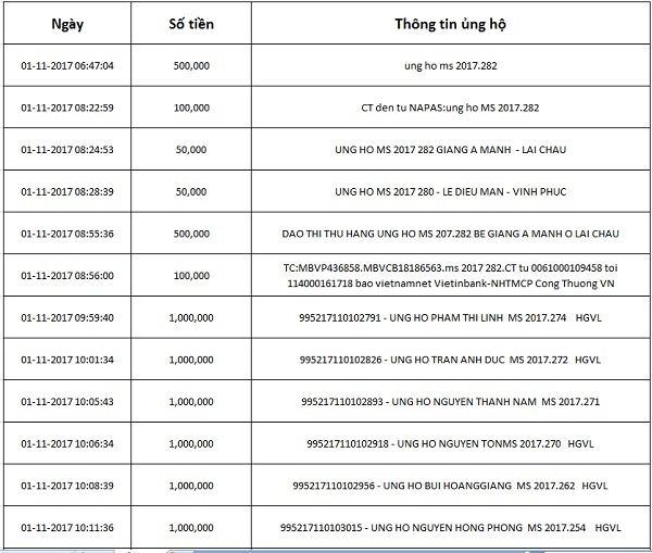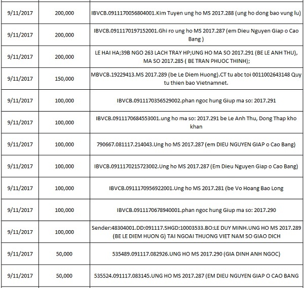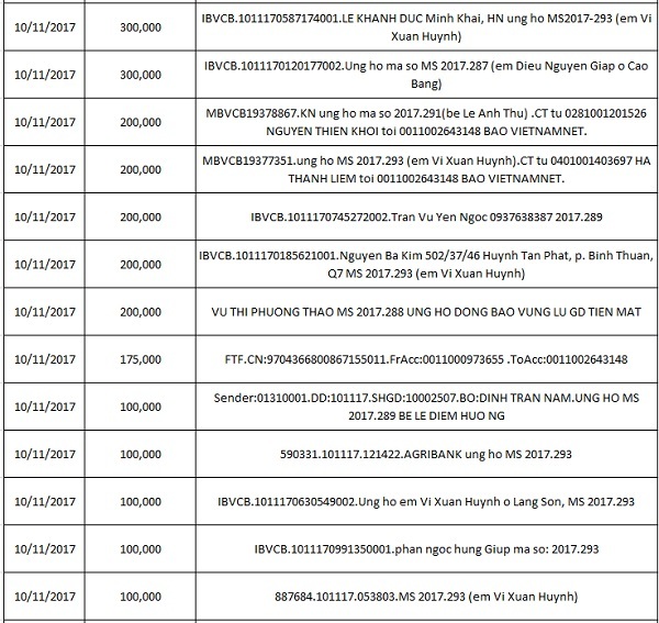 - Trong 10 ngày đầu tháng 11/2017, Báo VietNamNet đã nhận được số tiền 240.810.009 đồng giúp đỡ các hoàn cảnh khó khăn được đăng trên VietNamNet của các cá nhân và đơn vị sau.