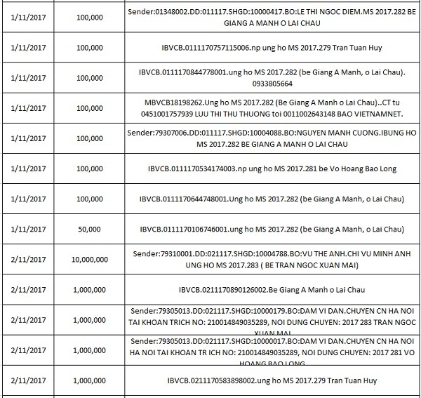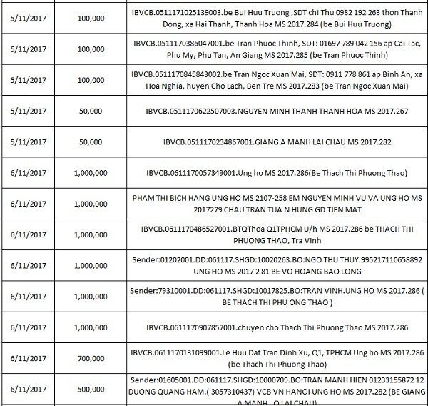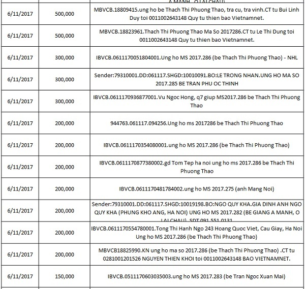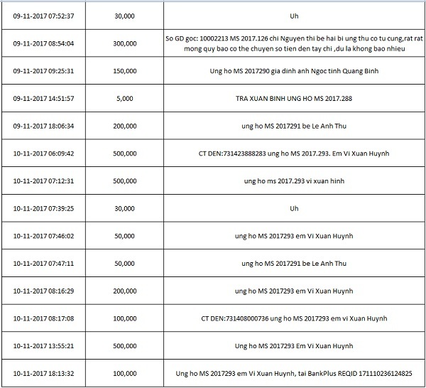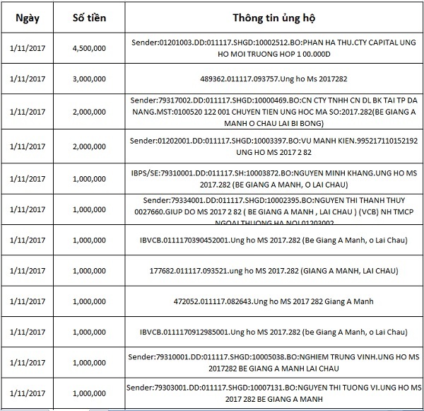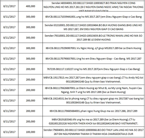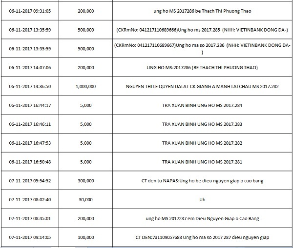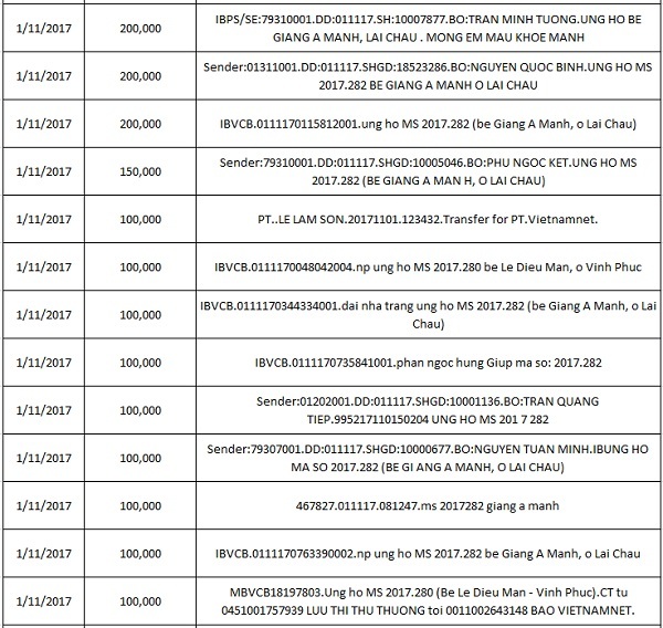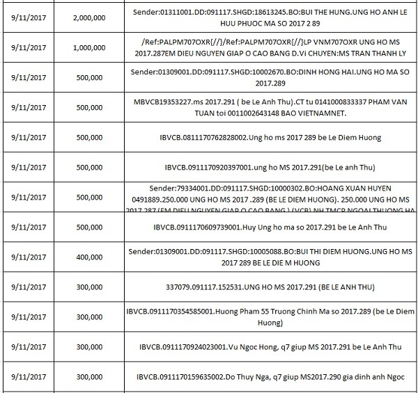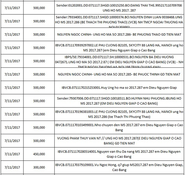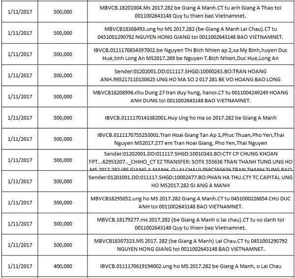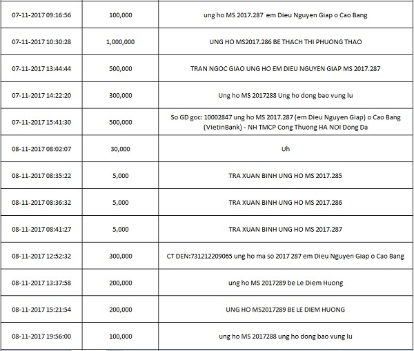 - Trong 10 ngày đầu tháng 11/2017, Báo VietNamNet đã nhận được số tiền 240.810.009 đồng giúp đỡ các hoàn cảnh khó khăn được đăng trên VietNamNet của các cá nhân và đơn vị sau.