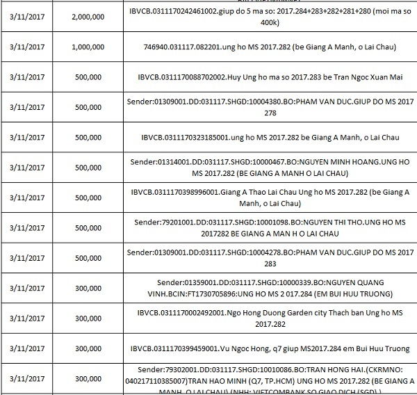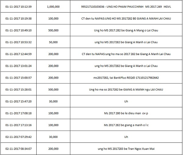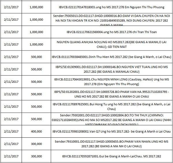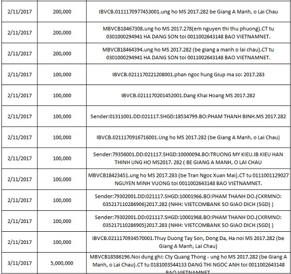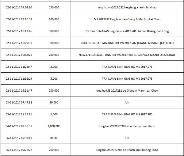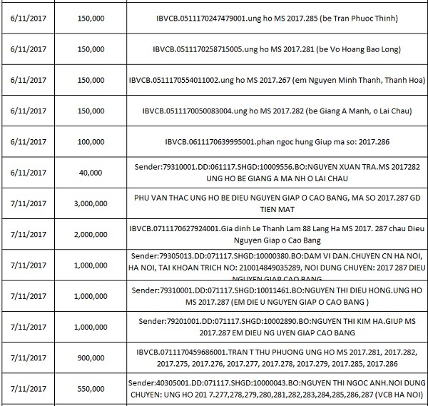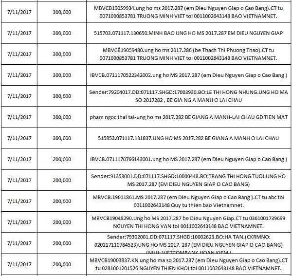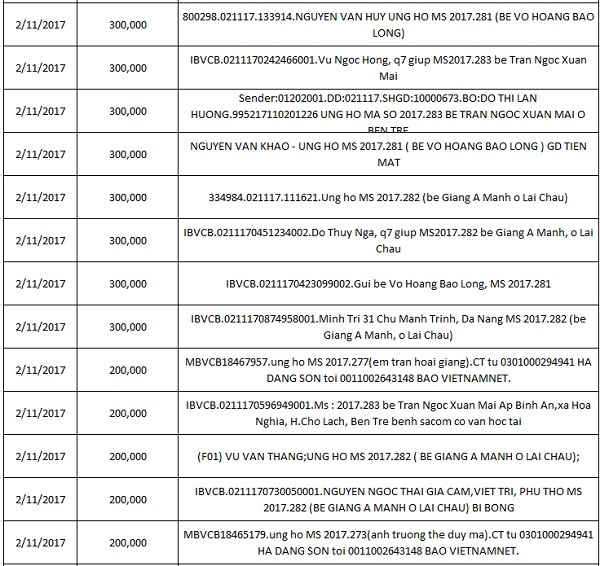 Trong 10 ngày đầu tháng 11/2017, Báo VietNamNet đã nhận được số tiền 240.810.009 đồng giúp đỡ các hoàn cảnh khó khăn được đăng trên VietNamNet của các cá nhân và đơn vị sau.