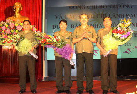 | Thay mặt Đảng ủy Công an Trung ương, lãnh đạo Bộ Công an, Trung tướng Trần Đại Quang, Ủy viên Bộ Chính trị, Bộ trưởng Bộ Công an tặng hoa chúc mừng Đại tướng Lê Hồng Anh, Trung tướng Bùi Văn Nam và Trung tướng Phạm Minh Chính. |