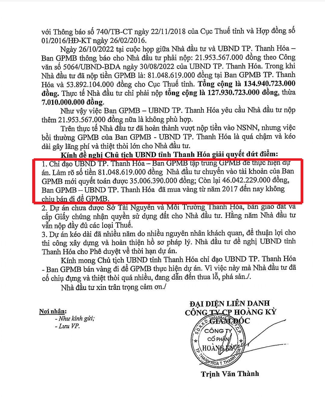 Trong nội dung văn bản có đoạn, đề nghị UBND tỉnh Thanh Hóa chỉ đạo, làm rõ số tiền hơn 81 tỷ đồng nhà đầu tư chuyển vào tài khoản của Ban GPMB mới quyết toán được 35 tỷ; còn 46 tỷ Ban đã mua vàng từ năm 2017 đến nay không chịu bán đi để GPMB.