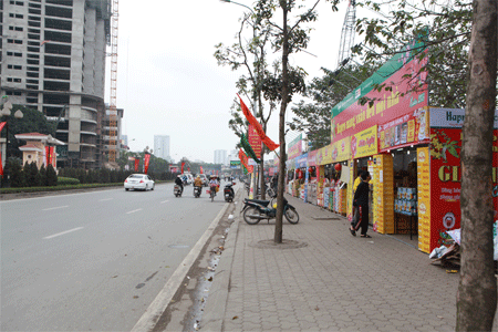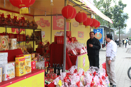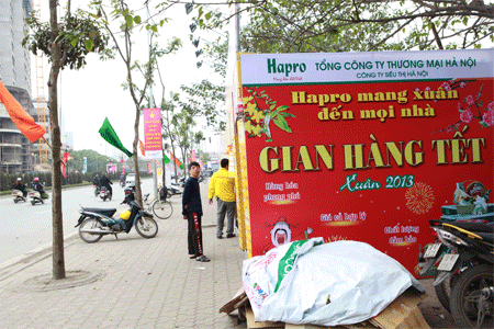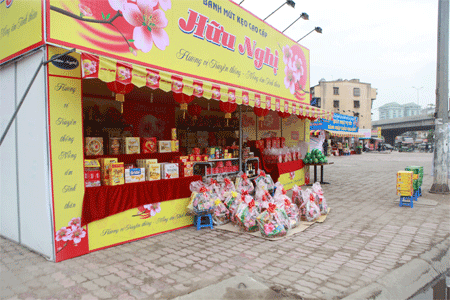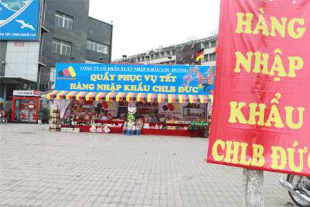 Trên vỉa hè các tuyến phố ở Hà Nội những ngày này tràn ngập những gian hàng bán dịp Tết. Từ rượu nhập khẩu đến bánh kẹo đều xuống đường để kéo khách. Tuy vậy, theo khảo sát của PV những gian hàng dù được trưng bày bắt mắt vẫn không thấy tấp nập người đến mua…