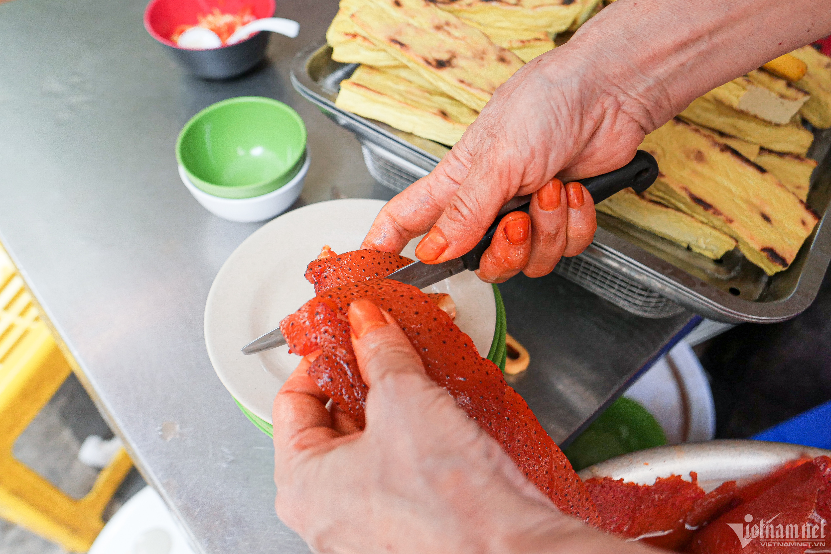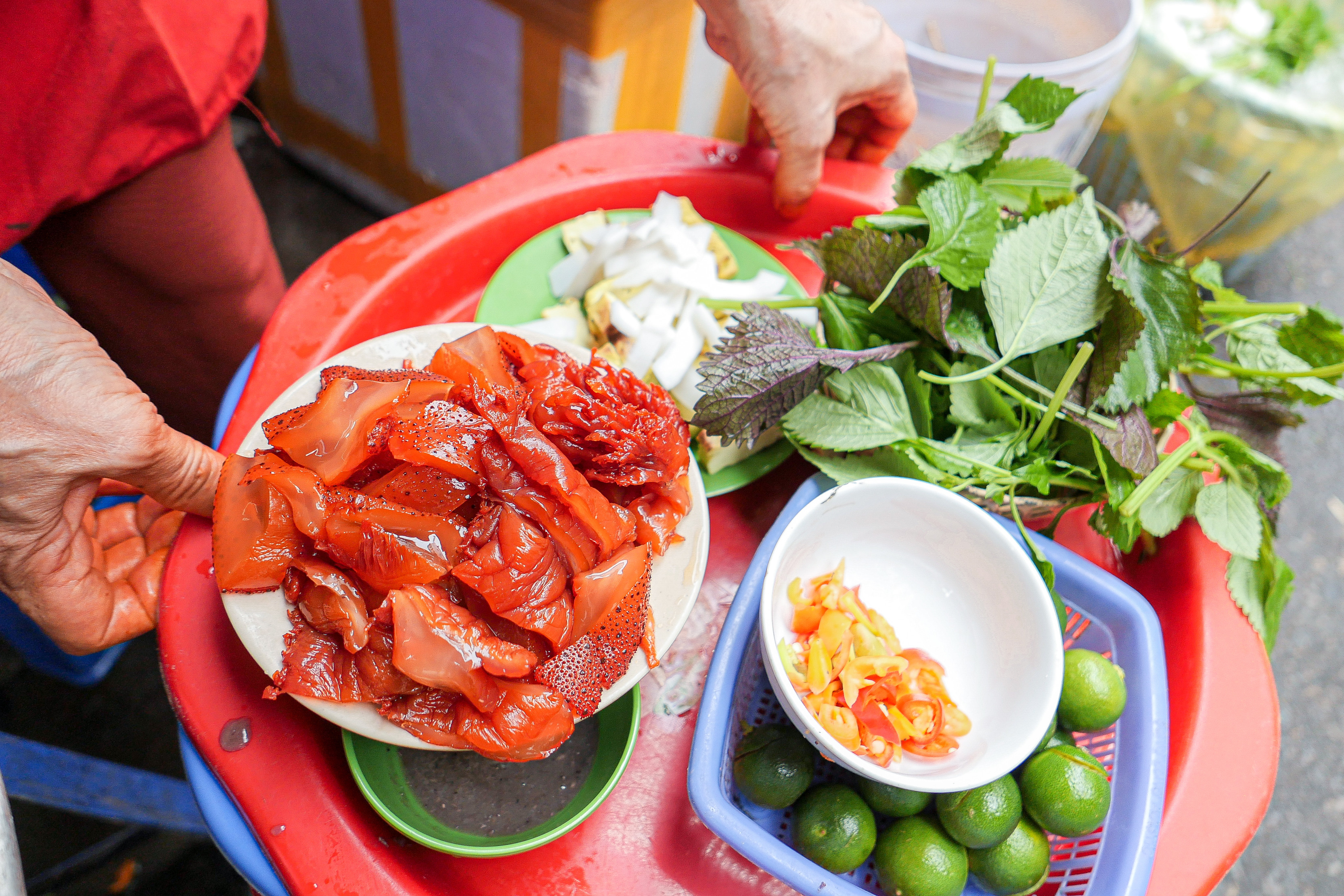 Ngày trước, người bán thường dùng que tre vót mỏng để cắt sứa. Tuy nhiên hiện nay, do sợ tre dễ mục nên bà Tuyết dùng loại dao inox rất sắc bén. Theo bà Tuyết, mỗi ngày, quán của bà bán hết 70-80kg sứa đỏ, ước chừng 500 suất. Phần lớn khách hàng là các tiểu thương, khách hàng tại chợ Đồng Xuân hoặc người dân khu vực lân cận.