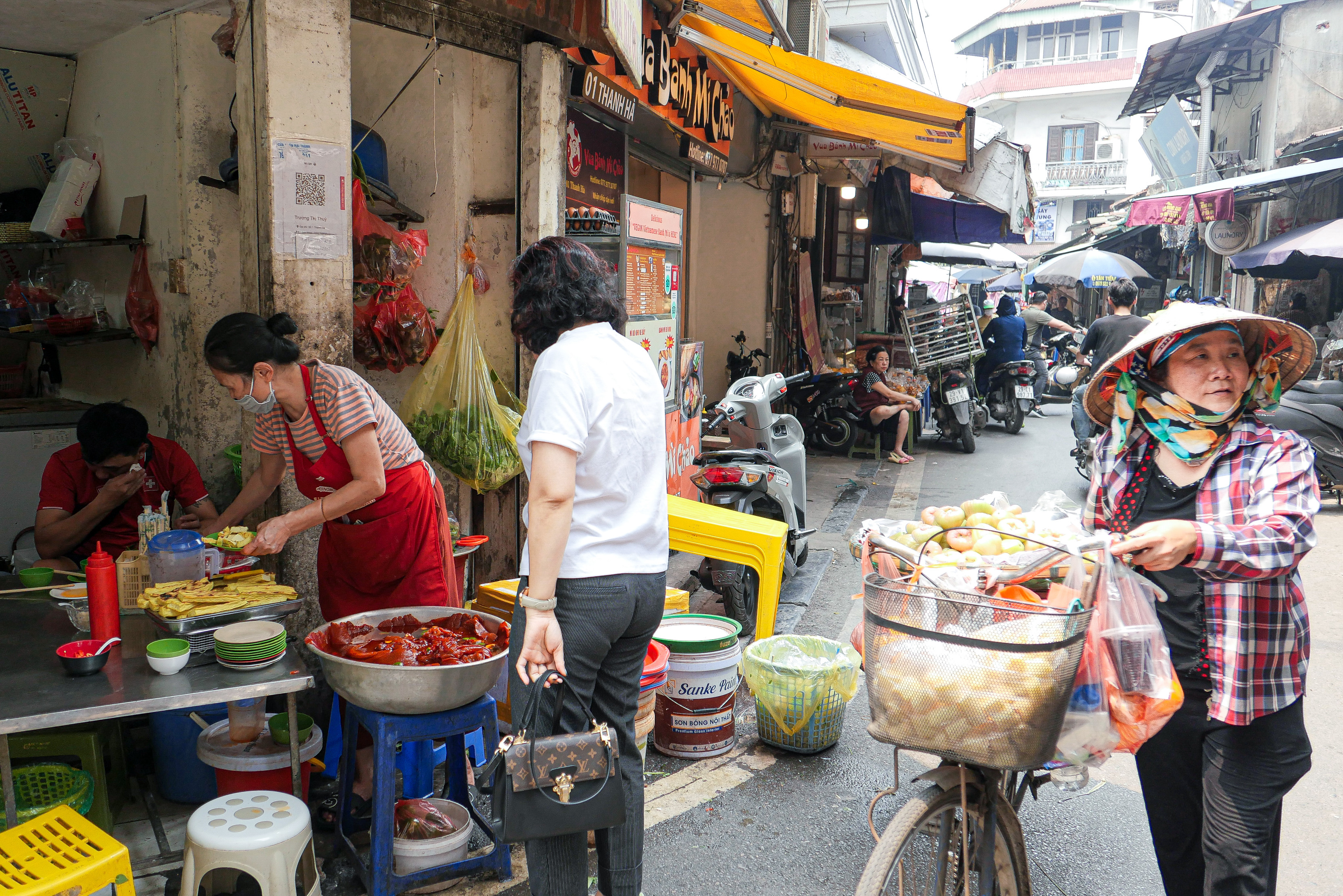 Bà Thu Tuyết (63 tuổi) ở ngõ Thanh Hà đã bán sứa đỏ gần 30 năm. Theo bà Tuyết, năm nay sứa đỏ có muộn hơn và mất mùa nên số lượng ít, giá thành cao. Toàn bộ sứa được gia đình bà nhập từ mối quen lâu năm tại Hải Phòng. Bà Tuyết vừa thoăn thoắt cắt sứa cho khách vừa chia sẻ: Sứa có màu đỏ ăn là do được ngư dân làm sạch rồi ngâm trong nước lá lăng, vỏ sú vẹtLoại hải sản này khi vận chuyển phải "nâng như nâng trứng" để giữ được độ tươi, ngon, không bị dập nát. "Sứa ngon phải có phần chân và bìa cứng, dày. Khi ăn, khách thấy giòn sần sật, mát lạnh", bà Tuyết cho hay. Khi sứa mang tới Hà Nội, bà tiếp tục ngâm, rửa, sơ chế rất nhiều lần. Khi đưa sứa ra chậu nhôm để chuẩn bị bán, bà Tuyết thường bỏ thêm vỏ chanh để khử mùi tanh.Chân sứa sần sật và giòn, còn thân sứa thì mềm như thạch, không cần ướp lạnh nhưng ăn vẫn có cảm giác thanh mát. Nhiều thực khách thường gọi đây là món ăn "hạ hỏa" hiệu quả trong mùa hèKhi ăn, thực khách đặt miếng sứa lên lá tía tô, lần lượt thêm cùi dừa thái mỏng, lát đậu nướng, lá kinh giới, cuộn tròn lại rồi chấm với mắm tôm. Phần cùi dừa phải chọn vừa khéo, không quá non cũng không quá già. Đậu nướng thơm, béo. Do sứa có tính hàn nên thực khách kết hợp thêm với tía tô và kinh giới - những loại thuốc Đông y, có tính ấm, giúp trung hòa món ăn, không gây đau bụngNhà bà Tuyết dùng mắm tôm Thanh Hóa rồi gia giảm thêm với mì chính, đường, chanh, ớt. Khi thưởng thức, khách đánh đều tay cho đến khi bọt mắm nổi lên, dậy mùi thơm
