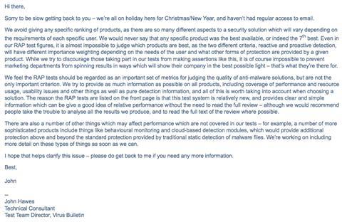 Chúng tôi tránh xếp hạng sản phẩm, vì có quá nhiều yếu tố trong một giải pháp bảo mật, mà chúng còn tuỳ thuộc yêu cầu của người dùng. Chúng tôi không bao giờ nói sản phẩm nào tốt nhất, hoặc sản phẩm nào xếp thứ 7. Ngay cả trên đồ thị RAP, gần như không để nhận định những sản phẩm nào là tốt nhất, vì nó có hai yếu tố: phản ứng (reactive: nhận diện vi rút đã xuất hiện) và ngăn chặn (proactive: nhận diện vi rút chưa biết đến)...