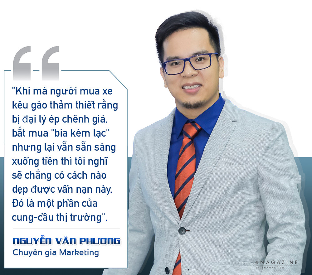 Theo ông Phương: "Việc bán ô tô bia kèm lạc là kiểu kinh doanh chộp giật trên nhu cầu của khách hàng, đương nhiên là đáng lên án và rất nên nghiêm cấm. Tuy vậy, cũng phải nhìn ngược lại là nếu khách hàng không chấp nhận bỏ thêm tiền so với giá trị thực tế thì chắc chắn các đại lý cũng không có đất trục lợi".