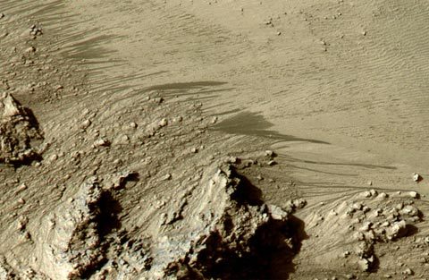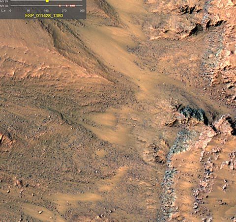 Bức tranh toàn cảnh ở vùng cực bắc sao Hỏa trong ngày Hạ chí 17/5/2011. Những dữ liệu thu thập từ hành tinh đỏ cho rằng có những chóp được bao phủ bởi nước đóng băng và carbon dioxide tồn tại ở dạng băng trong mùa đông và mùa xuân. Tuy nhiên, trong thời gian Hạ chí, tất cả carbon dioxide ấm lên và bốc hơi lên bầu khí quyển, chỉ còn lại nước đóng băng, được thể hiện ở khu vực trắng sáng trong bức ảnh này.