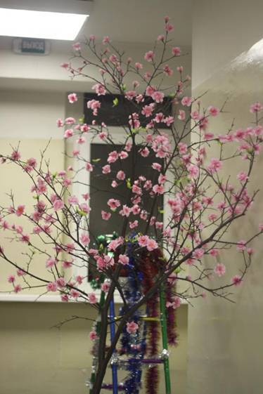 | Cành đào giả do chính các bạn sinh viên làm. |