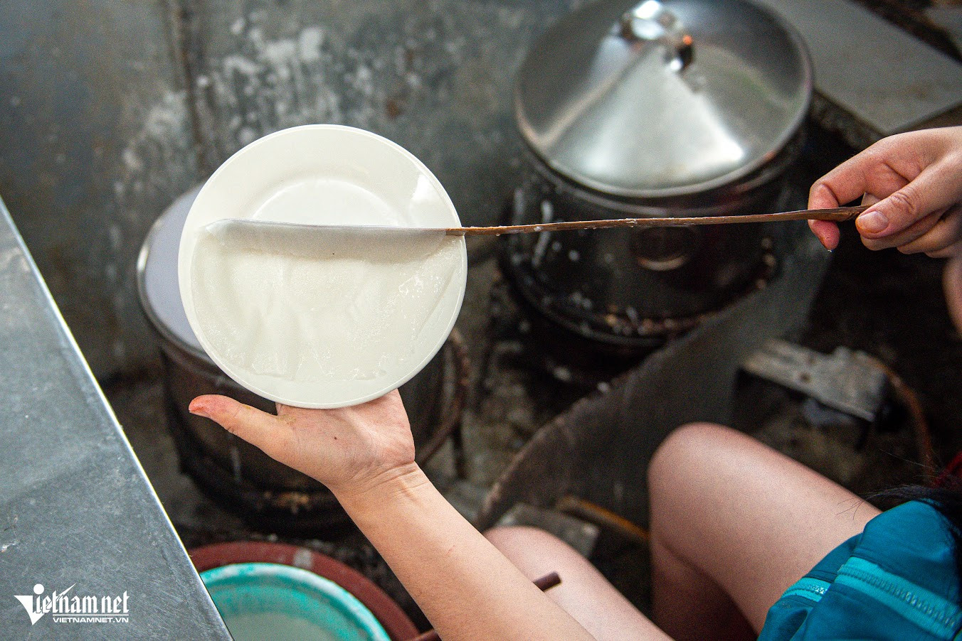 Phần bánh ướt được tráng ngay tại tiệm, khách gọi tới đâu tráng tới đó. Chiếc bánh "siêu mỏng", tròn trịa được chủ quán khéo léo đặt lên chiếc đĩa rồi rắc thêm chút mỡ hẹ, bột tôm khô. Theo chị Thủy Tiên, chủ quán bánh ướt chồng nổi tiếng tại hẻm 327 Hai Bà Trưng (Phường 6, TP Đà Lạt) quán dùng mỡ hẹ vì có mùi thơm hơn so với hành, phù hợp khẩu vị người Đà Lạt