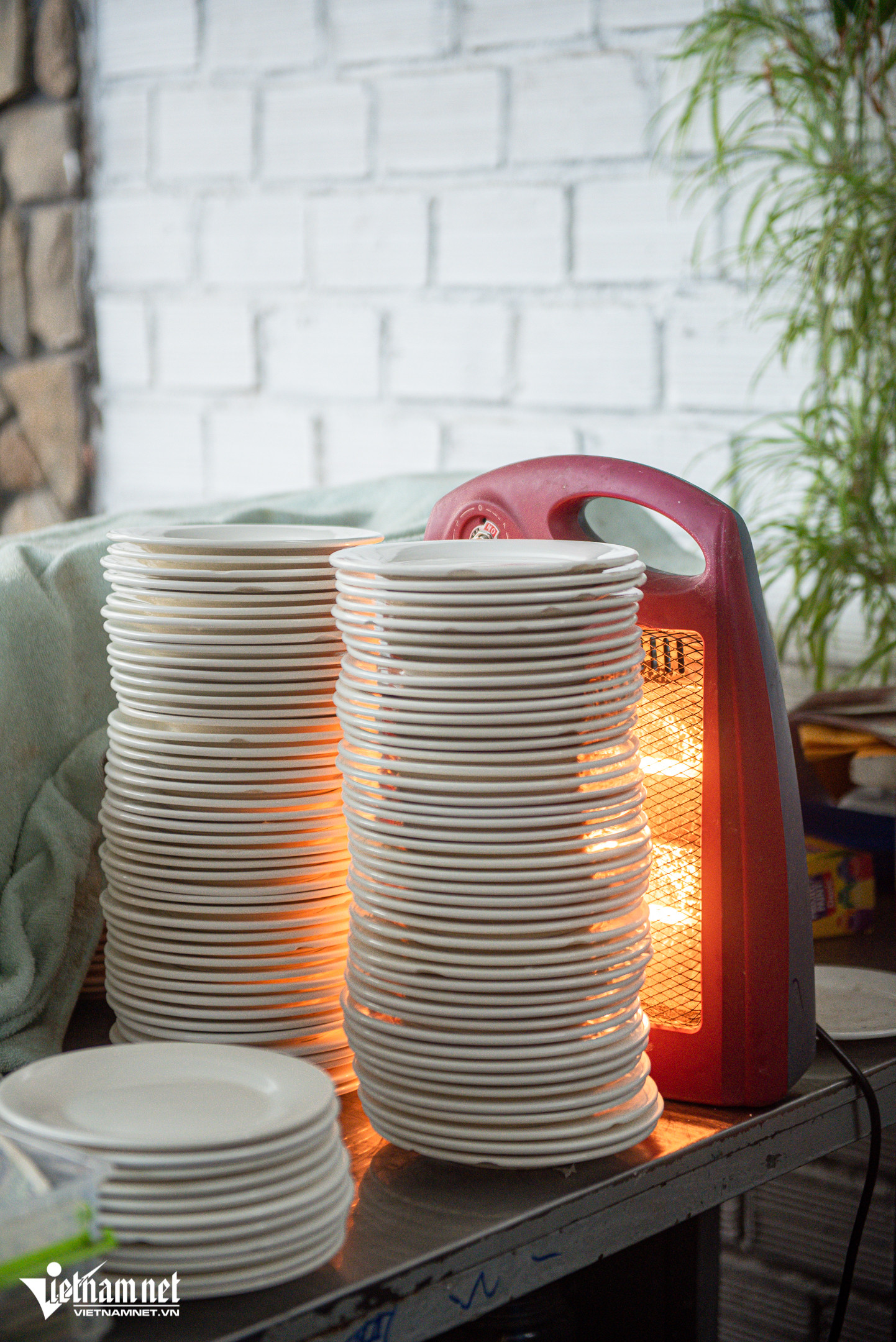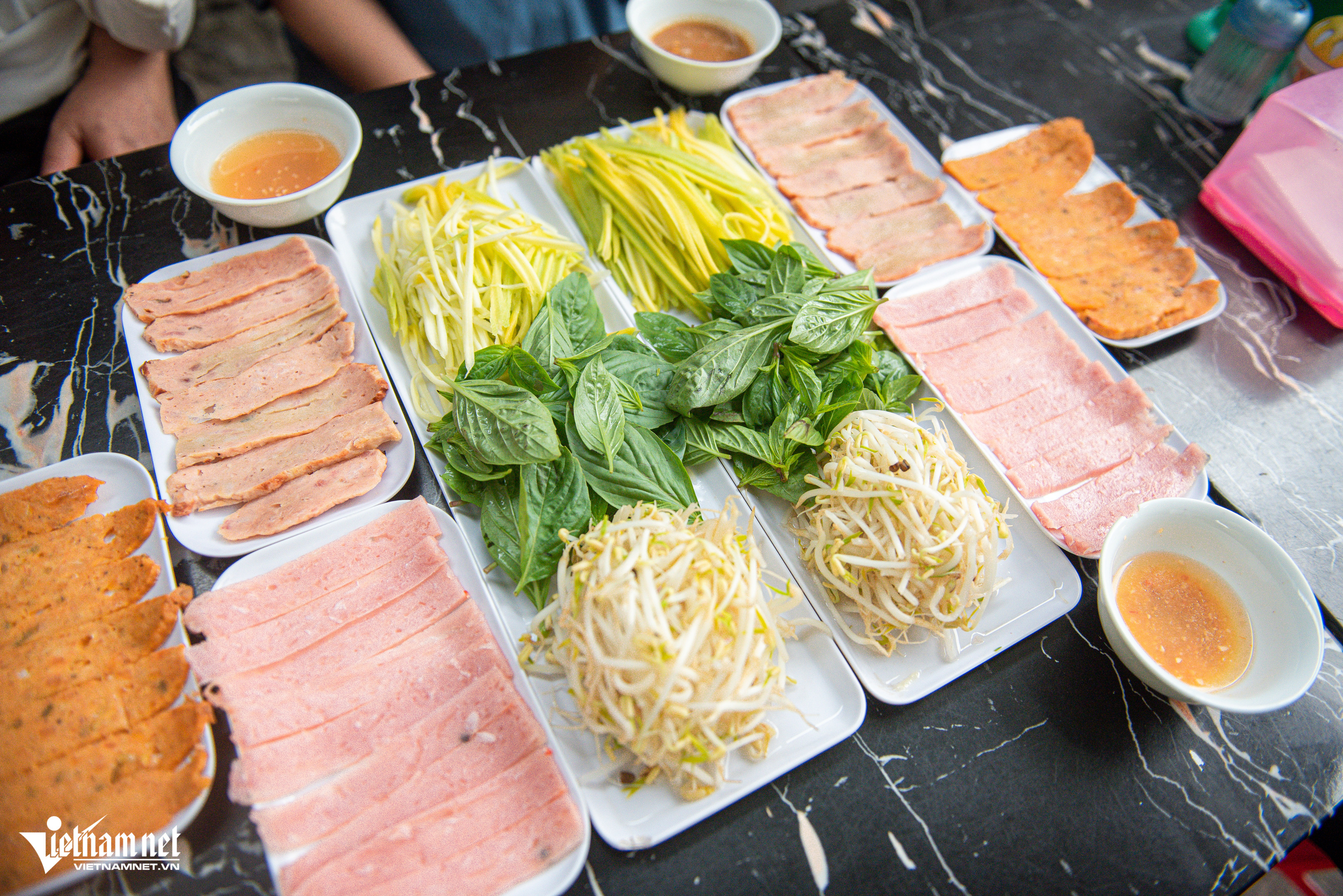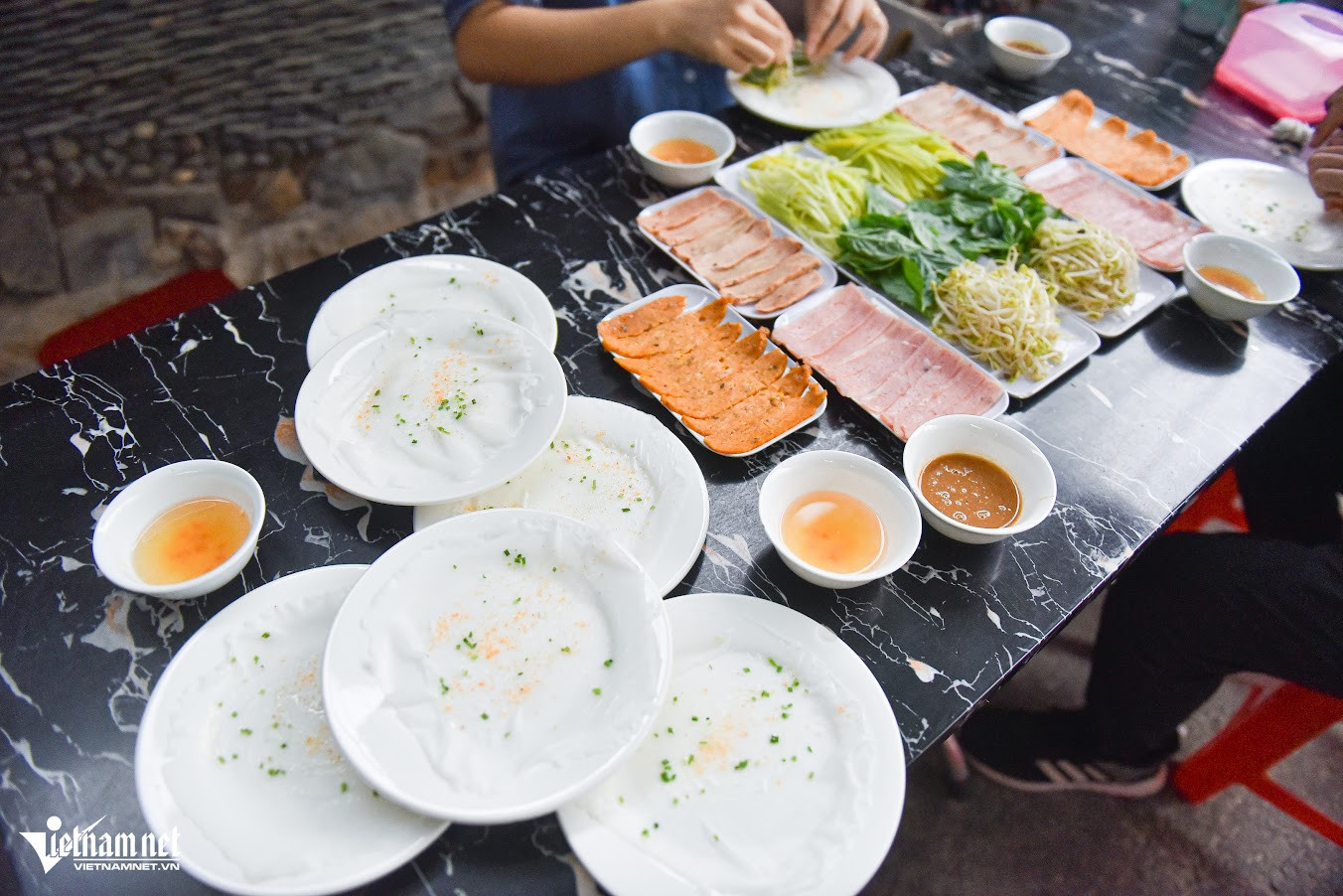 "Tôi bán món bánh ướt chồng đã hơn 5 năm. Thực chất, tôi học món này từ Nha Trang, sau đó biến tấu sao cho phù hợp với khẩu vị thực khách tại Đà Lạt. Trước đây gia đình tôi bán bánh cuốn nhiều năm nên khâu chọn gạo, làm bánh ướt sao cho mỏng, mềm, không bị rách, nát không quá khó", chị Tiên chia sẻNhiều thực khách khi tới quán thường tò mò vì thấy chồng đĩa được sấy lò sưởi trước khi sử dụng. Theo chị Tiên "tiết lộ", nhiệt độ Đà Lạt vào sáng sớm và chiều tối thường thấp khiến bát, đĩa sứ lạnh ngắt. Phần bánh ướt rất mỏng nên khi đặt lên đĩa sẽ nhanh nguội rồi lạnh tanh, không hấp dẫn. Đó là lí do, quán chị cho đĩa "nằm" lò sưởi trước khi mang ra đựng bánhĂn kèm bánh ướt chồng là các loại nhân như nem nướng, thịt nướng, nem chua, chả lụa kèm giá đỗ, xoài ương và lá húng quế. Phần nem nướng và thịt nướng, chị Tiên tự làm hàng ngày còn nem chua được đặt từ Ninh Hòa (Nha Trang, Khánh Hòa)Thực khách tự chọn đồ ăn kèm yêu thích rồi dùng bánh ướt cuốn gọn lại. Khi ăn, món bánh có đủ rau - thịt hài hòa nên không ngán, chấm với nước chấm để thêm tròn vịNước chấm tại quán có 4 loại khác nhau để phục vụ sở thích, khẩu vị thực khách như mắm nêm, xí muội, tương đậu và mắm pha chua ngọt. "Thực khách tới quán gồm nhiều du khách từ các vùng, miền nên tôi chuẩn bị 4 hương vị nước chấm. Mọi người có thể thử rồi chọn loại yêu thích hoặc chọn nước chấm tùy theo loại nhân ăn kèm", chị Tiên cho biếtỞ đây, mỗi đĩa bánh có giá 2.000 đồng, thực khách ăn bao nhiêu, tính tiền bấy nhiêu. Mỗi phần nhân ăn kèm là 19.000 đồng/đĩa, rau 12.000 đồng/đĩa. Quán mở từ 8h đến 21hBánh ướt chồng là món thanh mát, dễ ăn và mỗi đĩa chỉ có một lớp bánh mỏng nên mỗi người có thể ăn 15-20 đĩa. Thực khách thưởng thức rồi từ từ xếp đĩa thành những chồng cao "quá đầu người". Đây cũng là lí do mà món ăn này có cái tên là "bánh ướt chồng (đĩa)"Chủ quán cho biết, trong 5 năm mở bán bánh ướt chồng, từng có hai vị khách "lập kỷ lục" tại quán. Một nữ thực khách ăn tới 50 đĩa bánh ướt và một nam thực khách hoàn thành 70 đĩa