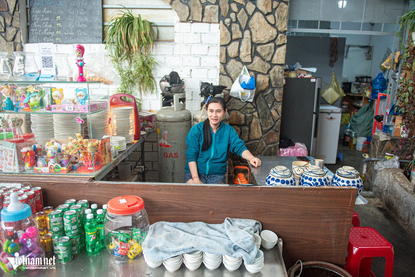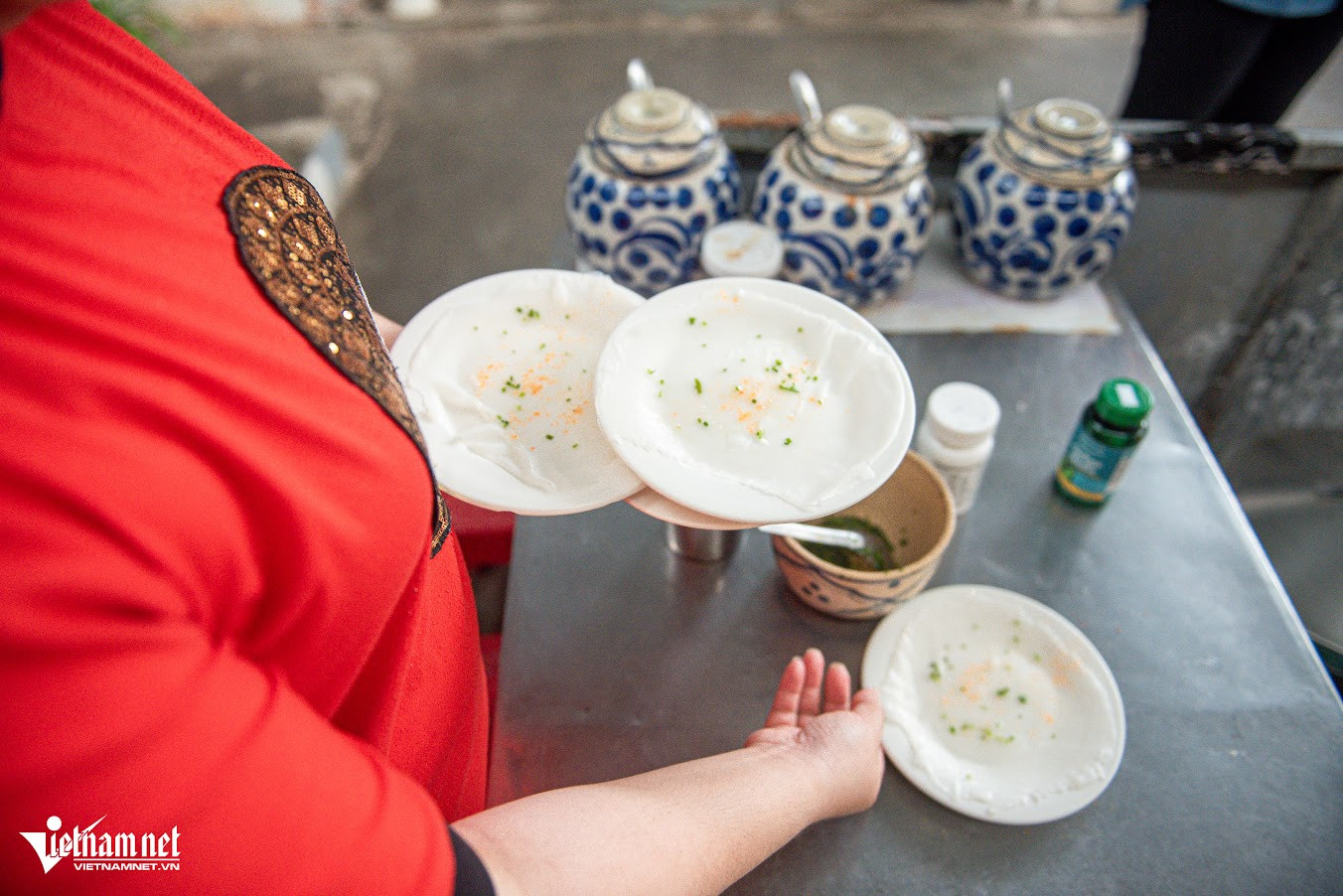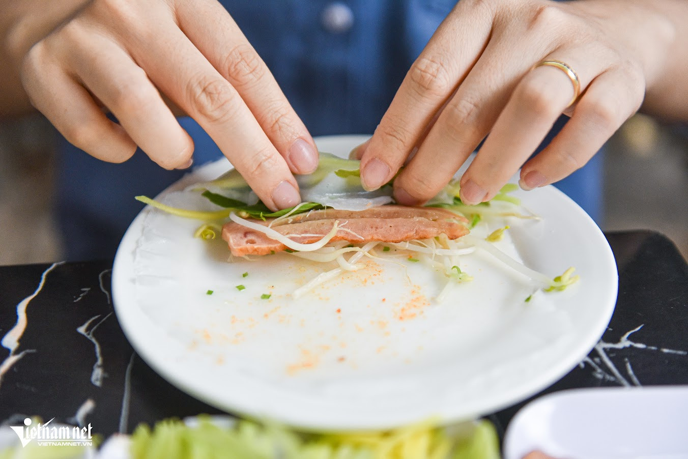 "Tôi bán món bánh ướt chồng đã hơn 5 năm. Thực chất, tôi học món này từ Nha Trang, sau đó biến tấu sao cho phù hợp với khẩu vị thực khách tại Đà Lạt. Trước đây gia đình tôi bán bánh cuốn nhiều năm nên khâu chọn gạo, làm bánh ướt sao cho mỏng, mềm, không bị rách, nát không quá khó", chị Tiên chia sẻNhiều thực khách khi tới quán thường tò mò vì thấy chồng đĩa được sấy lò sưởi trước khi sử dụng. Theo chị Tiên "tiết lộ", nhiệt độ Đà Lạt vào sáng sớm và chiều tối thường thấp khiến bát, đĩa sứ lạnh ngắt. Phần bánh ướt rất mỏng nên khi đặt lên đĩa sẽ nhanh nguội rồi lạnh tanh, không hấp dẫn. Đó là lí do, quán chị cho đĩa "nằm" lò sưởi trước khi mang ra đựng bánhĂn kèm bánh ướt chồng là các loại nhân như nem nướng, thịt nướng, nem chua, chả lụa kèm giá đỗ, xoài ương và lá húng quế. Phần nem nướng và thịt nướng, chị Tiên tự làm hàng ngày còn nem chua được đặt từ Ninh Hòa (Nha Trang, Khánh Hòa)Thực khách tự chọn đồ ăn kèm yêu thích rồi dùng bánh ướt cuốn gọn lại. Khi ăn, món bánh có đủ rau - thịt hài hòa nên không ngán, chấm với nước chấm để thêm tròn vịNước chấm tại quán có 4 loại khác nhau để phục vụ sở thích, khẩu vị thực khách như mắm nêm, xí muội, tương đậu và mắm pha chua ngọt. "Thực khách tới quán gồm nhiều du khách từ các vùng, miền nên tôi chuẩn bị 4 hương vị nước chấm. Mọi người có thể thử rồi chọn loại yêu thích hoặc chọn nước chấm tùy theo loại nhân ăn kèm", chị Tiên cho biếtỞ đây, mỗi đĩa bánh có giá 2.000 đồng, thực khách ăn bao nhiêu, tính tiền bấy nhiêu. Mỗi phần nhân ăn kèm là 19.000 đồng/đĩa, rau 12.000 đồng/đĩa. Quán mở từ 8h đến 21hBánh ướt chồng là món thanh mát, dễ ăn và mỗi đĩa chỉ có một lớp bánh mỏng nên mỗi người có thể ăn 15-20 đĩa. Thực khách thưởng thức rồi từ từ xếp đĩa thành những chồng cao "quá đầu người". Đây cũng là lí do mà món ăn này có cái tên là "bánh ướt chồng (đĩa)"Chủ quán cho biết, trong 5 năm mở bán bánh ướt chồng, từng có hai vị khách "lập kỷ lục" tại quán. Một nữ thực khách ăn tới 50 đĩa bánh ướt và một nam thực khách hoàn thành 70 đĩa