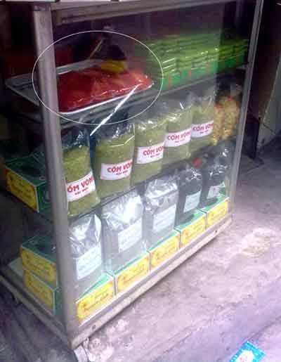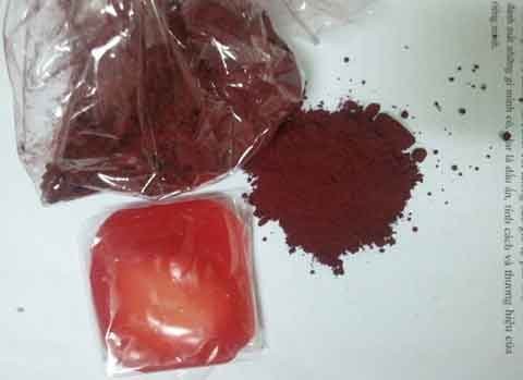 Thấy có người hỏi mua phẩm nhuộm màu bánh xu xê, chị T.T vội vàng quay sang nhắc nhân viên làm thuê lấy ở trong nhà ra loại hóa chất có màu đỏ tươi bắt mắt. Loại phẩm này không hề được đặt trên kệ bày bán công khai như nhiều loại phụ gia khác mà được giấu kín trong chiếc bao tải con, được cất giữ kín dưới ngăn tủ sâu trong nhà chị T. Nhìn túi màu không hề có nhãn mác, phóng viên yêu cầu được xem thông tin trên vỏ hộp nhưng người bán hàng xua tay: "Không có".