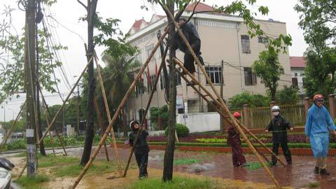 Sáng 30/7 có rất nhiều cây lớn tại địa bàn TP. Vinh đang được người dân tích cực chèo chống tránh đổ ngã. Ảnh: Quốc Huy |