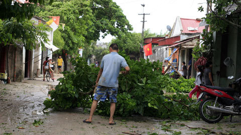 16h45 ngày 30/7, tai khu vực tâm huyện Tĩnh Gia (Thanh Hoá), tất cả các hoạt động dường như chỉ tập trung vào việc lo chống bão. Dọc tuyến đường xuống xã Hải Thanh, những cơn gió to khiến nhiều cành cây bị gãy đang được người dân thu dọn.