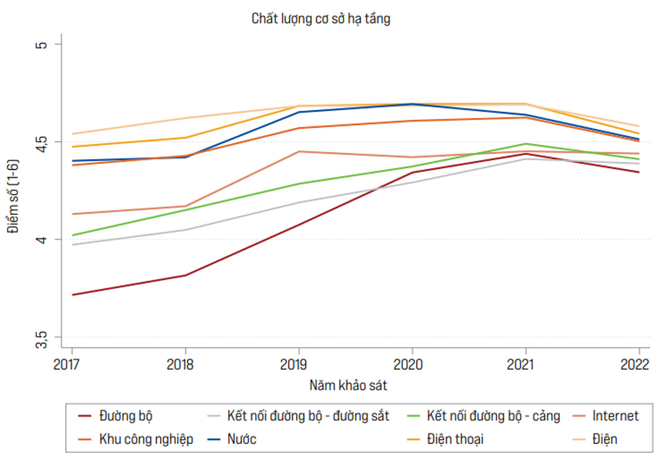Theo báo cáo PCI 2022, chỉ số cơ sở hạ tầng gồm 5 thành phần, gồm: khu công nghiệp, đường bộ, điện năng, viễn thông và các hạ tầng khác.