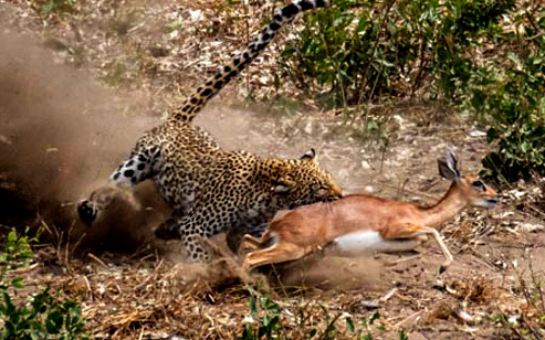 Có vẻ như linh dương đã cảm nhận được sự nguy hiểm ở quanh mình, nhưng nó vẫn không thể thoát thân sau cú vồ mồi điện giật của báo đốm tại vườn quốc gia Kruger, Nam Phi.