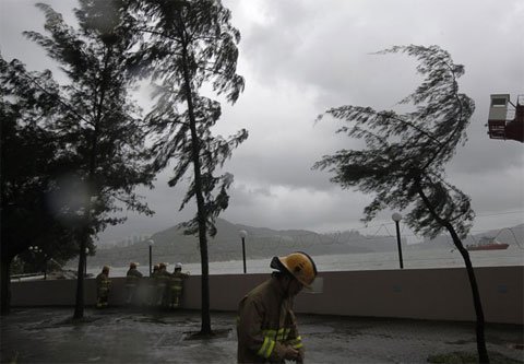 Lính cứu hỏa tại Hong Kong đương đầu với gió và mưa lớn khi bão Nesat tấn công khu vực này.