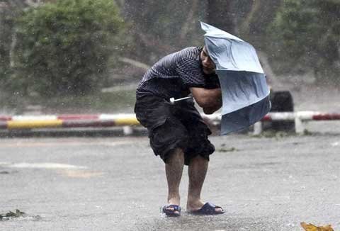 Một nam giới đang cố chống chọi với gió mạnh và mưa lớn trên đường phố khi bão Nesat tấn công tỉnh Hải Nam, Trung Quốc.