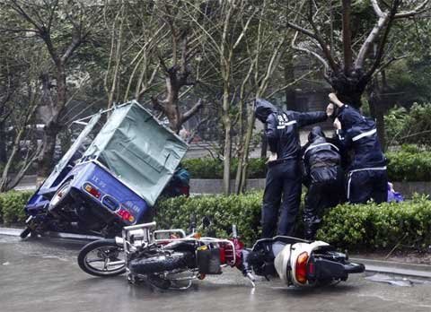 Người đi xe buộc phải bỏ phương tiện để túm lấy một cái cây bên đường khi bão lớn tấn công phía nam Trung Quốc