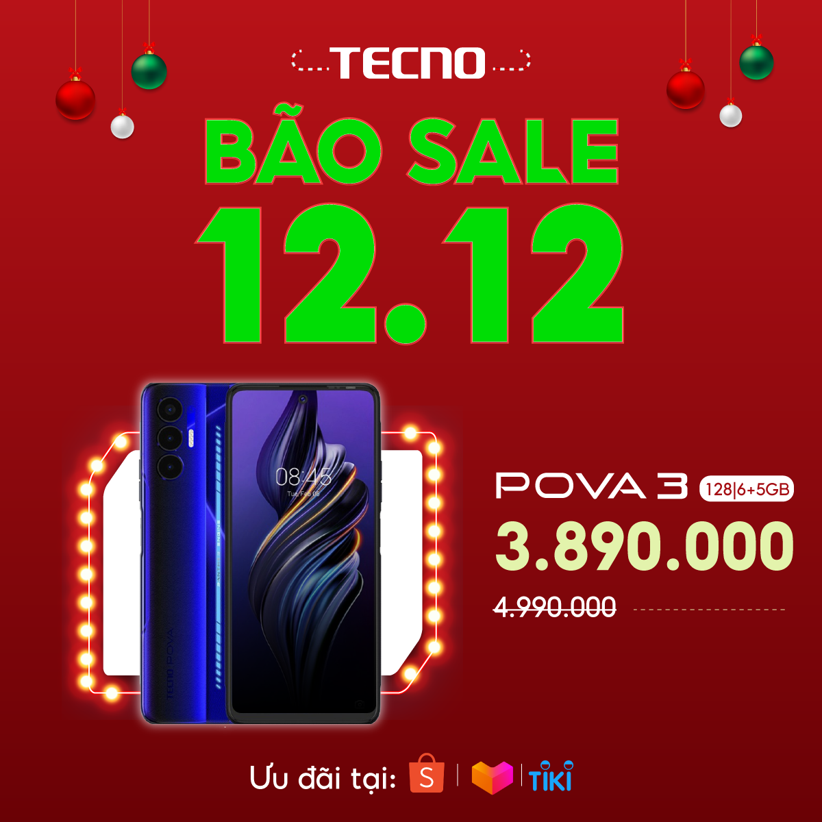 Từ khi ra mắt đến hiện tại, Pova 3 đã “phá đảo” phân khúc điện thoại tầm 4 triệu với nhiều tính năng ưu việt trong tầm giá. Sản phẩm có ngoại hình nổi bật với dãy đèn led mặt lưng, màn hình ấn tượng lên đến 6.9 inch FHD+ cùng tần số quét màn hình 90Hz đi kèm vi xử lý Helio G88, sở hữu bộ nhớ 128GB và RAM 6GB có thể mở rộng RAM thêm 5GB đáp ứng các trò chơi như Liên Quân Mobile, PUBG Mobile... Trong dịp ưu đãi cuối năm 12/12, sản phẩm tiếp tục giảm sâu hơn 1 triệu đồng và chỉ còn 3.890.000 VNĐ.