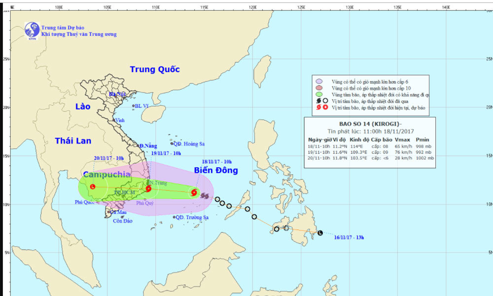 Hồi 10h ngày 18/11, vị trí tâm bão ở vào khoảng 11,2 độ Vĩ Bắc; 114,0 độ Kinh Đông, ngay trên phía Bắc quần đảo Trường Sa, cách bờ biển các tỉnh Khánh Hòa-Ninh Thuận-Bình Thuận khoảng 510 km về phía Đông Đông Nam. Sức gió mạnh nhất ở vùng gần tâm bão mạnh cấp 8 (60-75km/giờ), giật cấp 11.