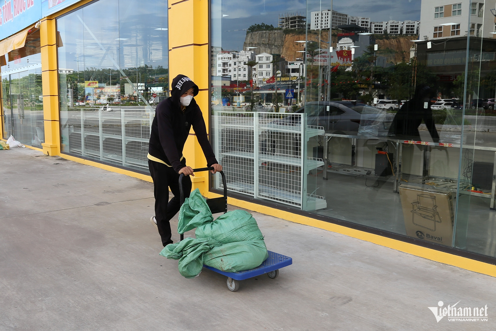 Tại các khu vực kính của cửa hàng đều được chống thanh sắt và bao cát để tránh nước tràn vào. Bên trong máy móc được bọc túi nilon, hàng hóa được di chuyển bớt sang khu vực khác.