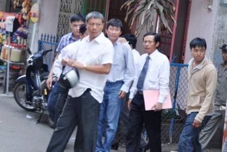 | Báo Tuổi Trẻ cùng luật sư Phan Trung Hoài (người đeo caravat) đang thực hiện các thủ tục đề nghị cơ quan điều tra, viện kiểm sát cho phóng viên Hoàng Khương được tại ngoại vì lý do hoàn cảnh gia đình và sức khỏe cá nhân. |