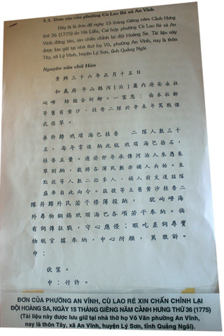 Cầm trên tay nhiều tài liệu quý liên quan đến tộc họ và các sắc lệnh của hai triều Tây Sơn và nhà Nguyễn về việc chấn chỉnh, tuyển mộ và đưa binh phu đi Hoàng Sa, ông Võ Văn Út (54 tuổi) ở thôn Tây, An Vĩnh (Lý Sơn) bảo: "Ngày trước, muốn đọc các tài liệu này, họ Võ phải họp tại nhà thờ cụ Võ Văn Khiết, sau đó thắp hương khấn vái, đánh trống trang trọng rồi mới mở ra đọc. Làm như vậy để thể hiện tôn kính vong linh tổ họ Võ trên đảo, vừa bảo quản để tránh thất lạc. Sở dĩ phải cẩn thận như thế, vì có nguyên nhân sâu xa của nó..."