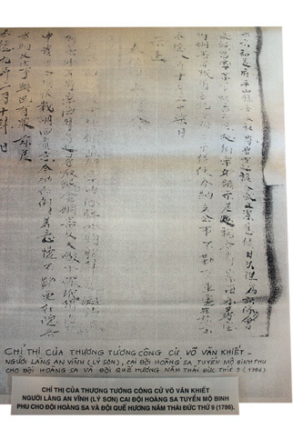 Ấy là vào năm 1979, do sai lầm một thời, văn tự ở nhiều đền miếu bị hủy đi, thế nhưng nhiều dòng họ của đảo Lý Sơn vẫn giấu được sắc lệnh vua ban liên quan đến việc ra đi thiết lập chủ quyền và giữ gìn biển đảo ở Hoàng Sa. Còn tờ lệnh của Thái phó tổng lý quản binh dân chư vụ Thượng tướng công, năm Thái Đức thứ 9 (đời Nguyễn Nhạc), ngày 14/2/1786 nhà Tây Sơn lệnh cho ông Võ Văn Khiết đưa binh phu đi Hoàng Sa thu lượm hóa vật thì bị mất bản gốc. Theo ông Út, hồi đó có ông Diệp Định Hoa (viện Hán Nôm) và ông Trần Văn Cầu (viện Khảo cổ học) được chính quyền đưa đến tộc họ Võ để "mượn" tờ lệnh nghiên cứu. "Nói thiệt, chính quyền đưa người đến thì ai mà không đưa ra. Mấy ông nói là, sau khi nghiên cứu xong sẽ trả bản gốc, còn khi về Hà Nội sẽ photocoppy một bản gửi lại cho dòng họ...", ông Út kể. Thế rồi tờ lệnh này đi mãi đến giờ, cả dòng họ mong chờ mãi vẫn khong thấy trả về. Ông Võ Văn Tắc, một người con của họ Võ-Lý Sơn (cán bộ tập kết ra Bắc) từng đến gặp hai nhà nghiên cứu và các viện nói trên để đòi lại tờ sắc lệnh này nhưng kết quả không như mong muốn. Bây giờ hai nhà nghiên cứu ấy, người đã mất, người thì không còn minh mẫn...