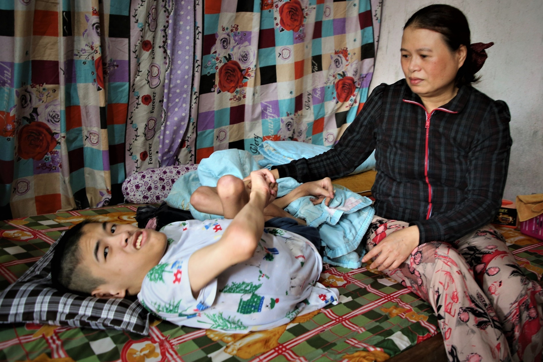 Bản thân bà cũng mang nhiều bệnh như đau dạ dày, thoái hóa cột sống do bế con quá lâu, nhưng bà chưa từng dám đi khám. Bởi vì chỉ sợ mình gục xuống thì không còn ai lo cho con nữa.