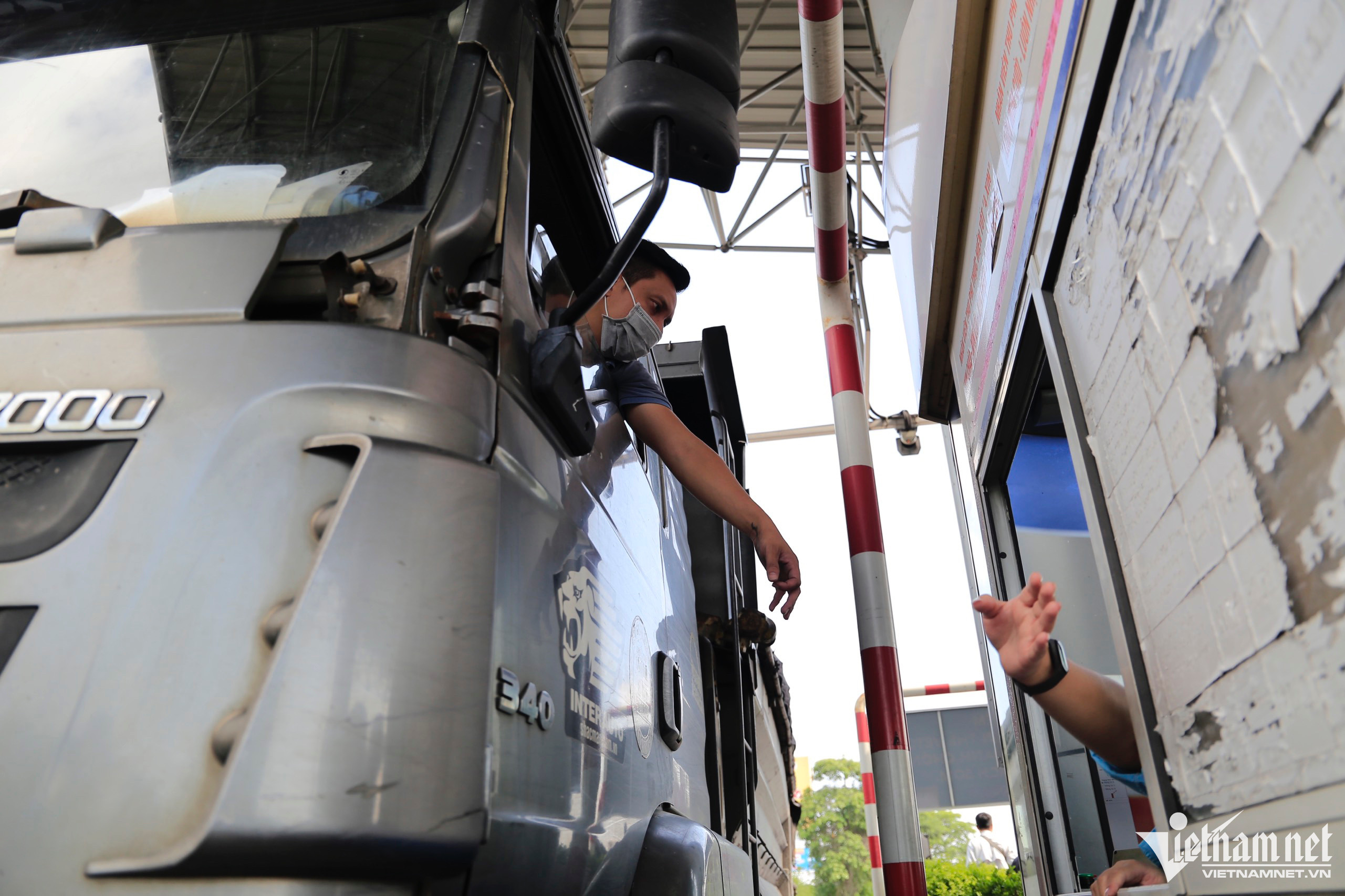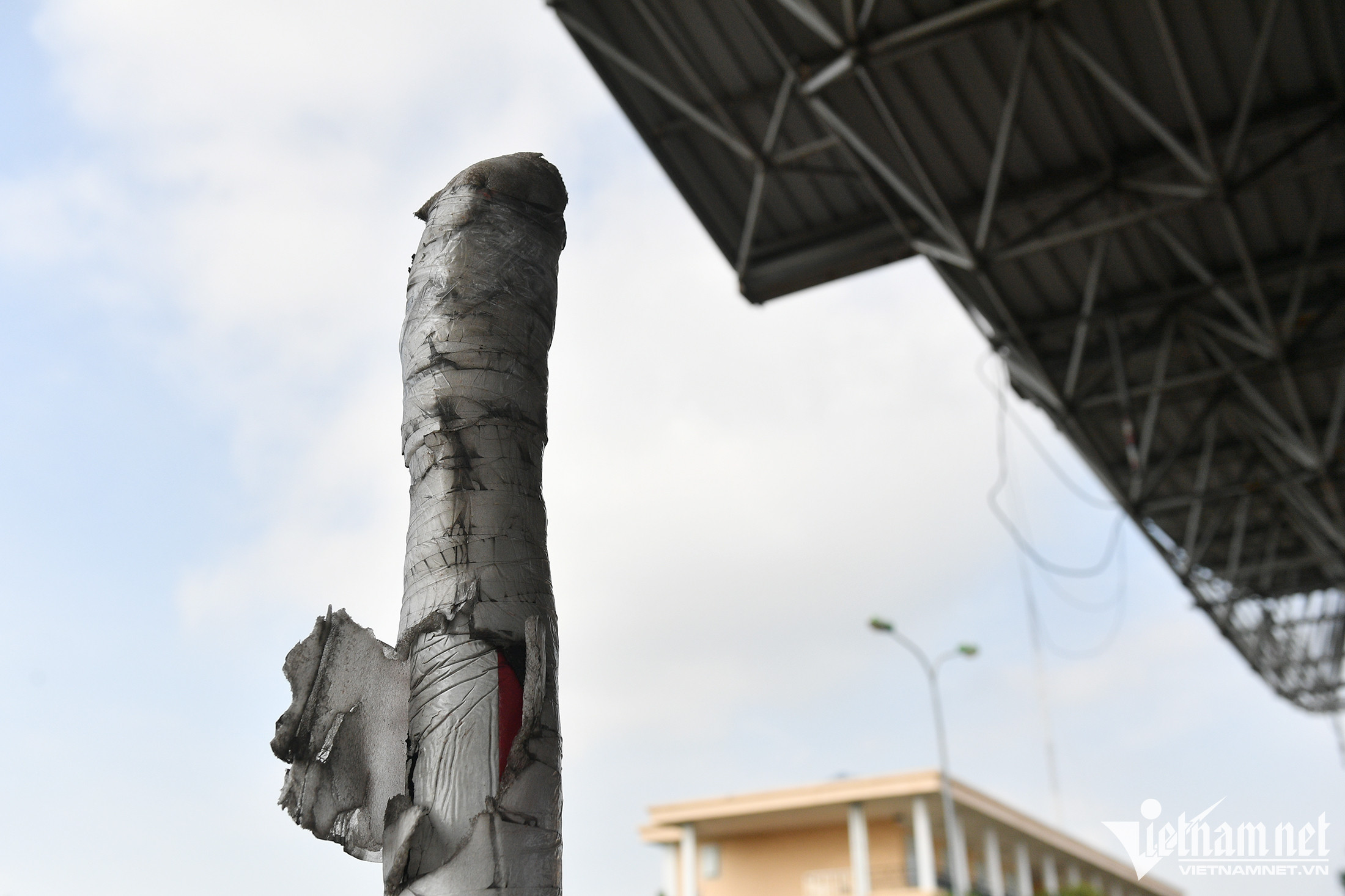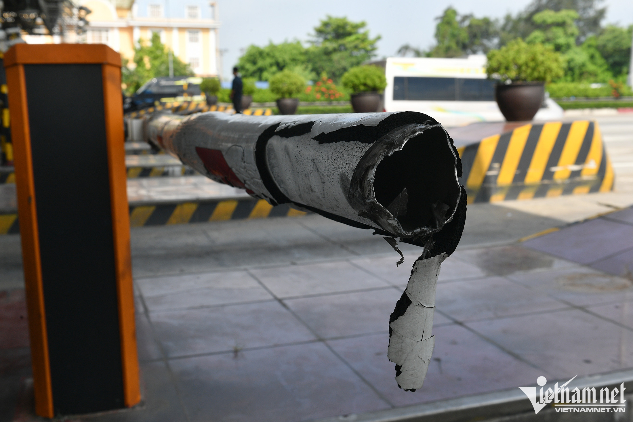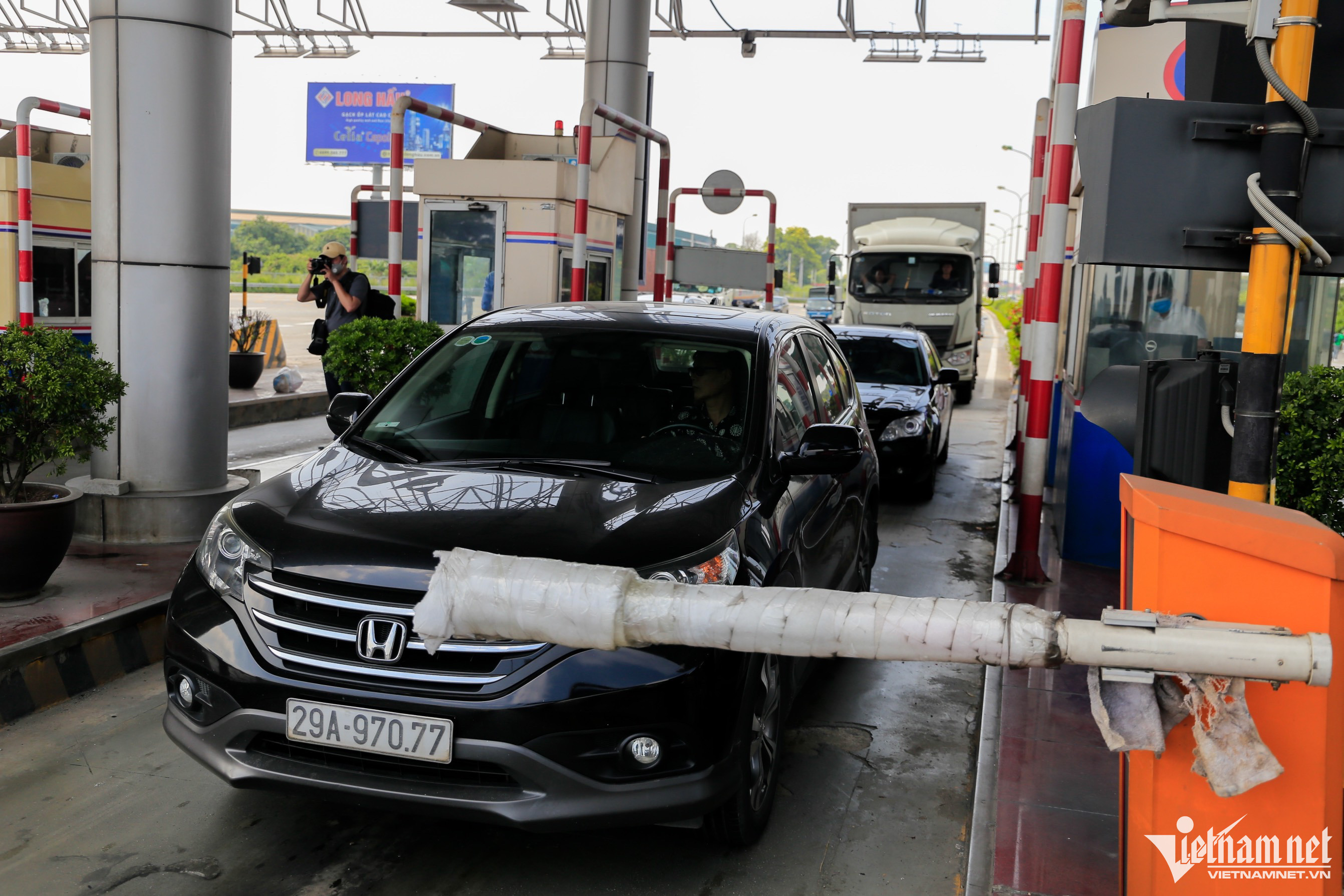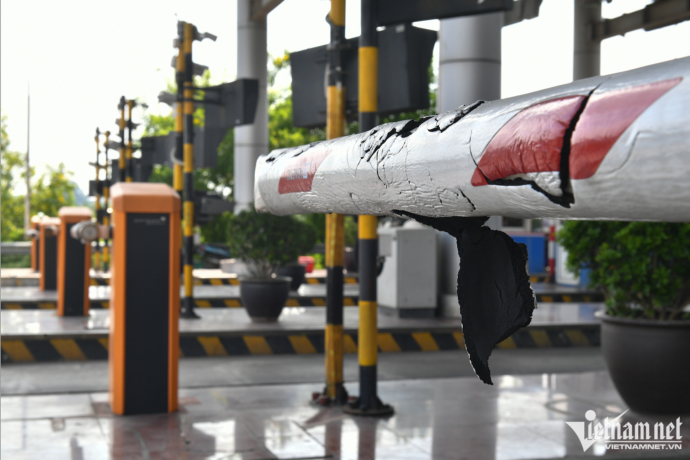 Hàng loạt barie ở Trạm thu phí Pháp Vân - Cầu Giẽ phải được bao bọc tạm bằng băng dính.