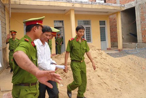 Ông Nguyễn Tuấn Cảnh bị dẫn giải ra khỏi Trung tâm bán đấu giá tài sản (Ảnh: Báo Bình Phước) |
