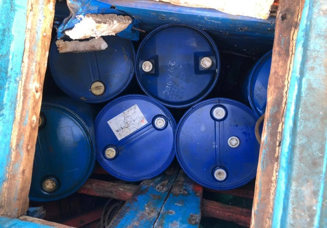 Qua kiểm tra, tổ công tác đã phát hiện trong khoang 2 tàu cá có 33 thùng đựng dầu Diesel, ước tính khoảng 7.000 lít dầu.