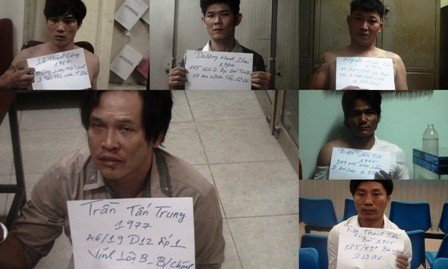 | Trần Tấn Trung (ảnh lớn) và 5 đàn em bị bắt giữ tại cơ quan công an |