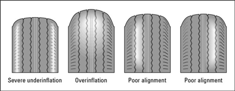 Các hiện tượng dẫn tới hao mòn gân lốp xe, từ trái qua: 1. Lốp non hơi, 2. Lốp căng hơi, 3 & 4. Lốp bị đặt lệch |