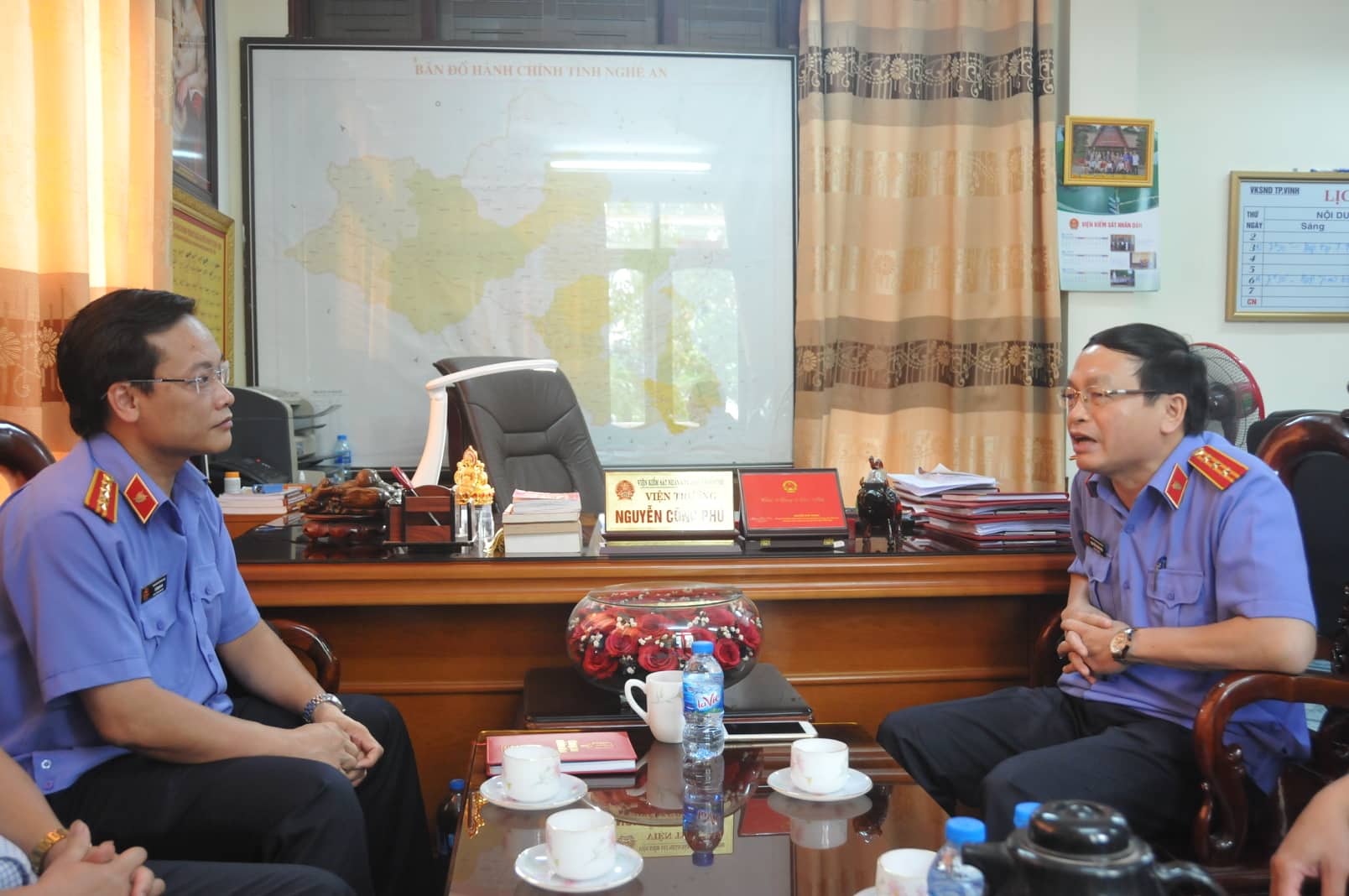 | Viện trưởng VKSND TP Vinh Nguyễn Công Phú (phải) trao đổi với báo chí |