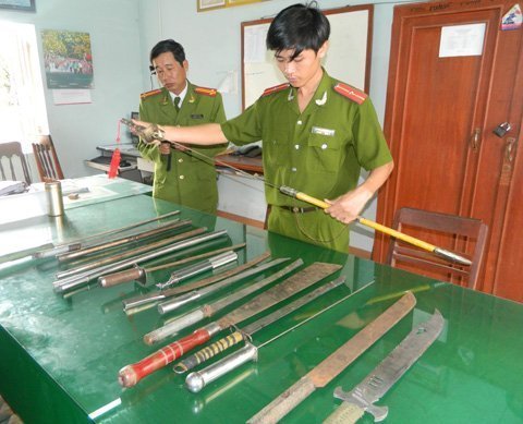 Công an huyện Đức Phổ đã tổ chức khám xét nhà tên Lê Trung Kha thì phát hiện một thùng hung khí với trên 20 cây kiếm, mã tấu, lưỡi lê, côn,… của tên Kha tàng trữ để gây án.