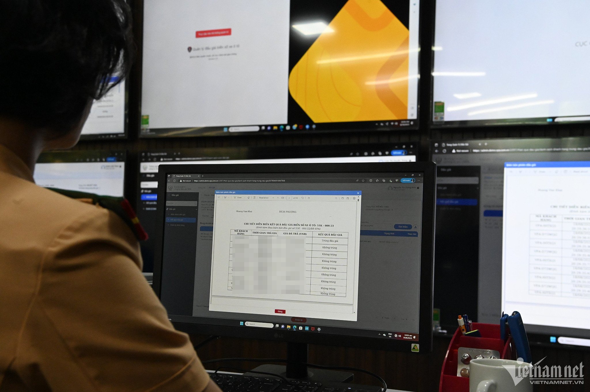Tại phòng quản lý, giám sát đấu giá biển số xe ô tô đặt tại trụ sở Cục CSGT (Bộ Công an), cán bộ làm nhiệm vụ giám sát đấu giá sẽ theo dõi toàn bộ diễn biến các cuộc đấu giá thông qua "Hệ thống quản lý đấu giá biển số xe ô tô".