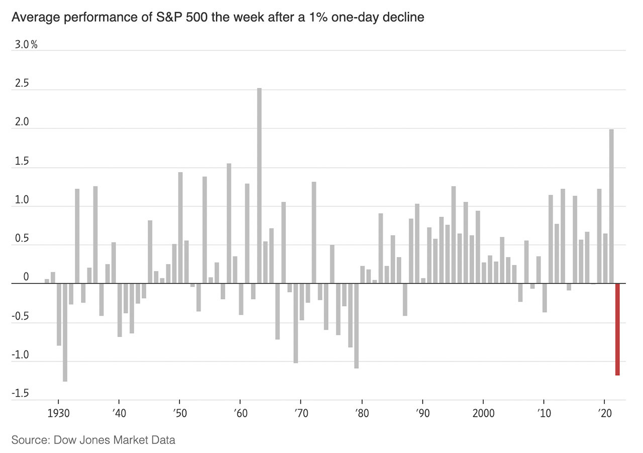 Theo dữ liệu từ Dow Jones Market Data, từ đầu năm 2022, sau mỗi phiên giảm ít nhất 1%, trong vòng 1 tuần sau đó, chỉ số S&P 500 giảm thêm bình quân 1,2%. Đây là con số lớn nhất kể từ năm 1931.