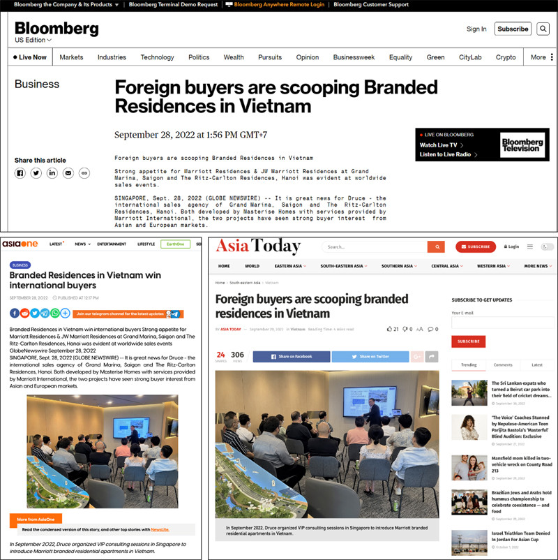 Ông Martin Koh, CEO Druce Singapore, cho biết, “Chúng tôi tự tin có thể giúp Việt Nam ghi điểm tại thị trường quốc tế, vì hai dự án của Masterise Homes có điểm mạnh mà nhiều sản phẩm khác không có - đó là danh tiếng toàn cầu của các thương hiệu thuộc tập đoàn Marriott. Đây không phải là ý kiến chủ quan của Druce. Chính phản hồi tích cực từ sự kiện vừa qua đã chứng minh sức hấp dẫn ‘xuyên biên giới’ của các dự án căn hộ hàng hiệu”.