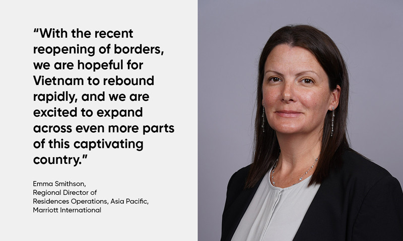 Trả lời Bloomberg về tiềm năng của Việt Nam, bà Emma Smithson, Giám đốc khu vực châu Á - Thái Bình Dương của Marriott International chia sẻ, “Với việc mở cửa du lịch trở lại, chúng tôi hy vọng Việt Nam sẽ phục hồi nhanh chóng và rất mong có thể tiếp tục mở rộng danh mục của mình đến nhiều địa điểm tại đất nước đầy sức hút này”.