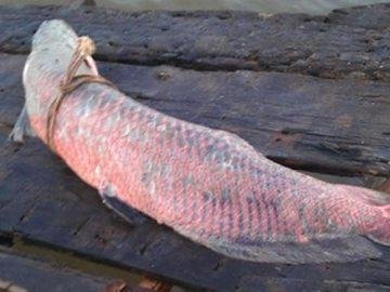 Một con cá rồng có trọng lượng khoảng 50kg, dài 1,75m với hai chiếc râu, vảy màu đỏ lấp lánh…đã được hai ngư dân hai ngư dân đánh bắt trên sông Hậu, đoạn gần khu vực công viên bến Ninh Kiều, TP Cần Thơ.