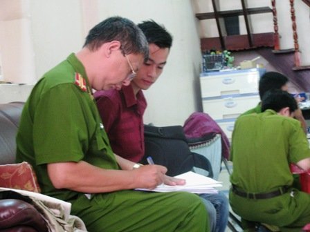| Nguyễn Đức Đông Anh (áo đỏ) làm việc với cơ quan công an tại nhà |