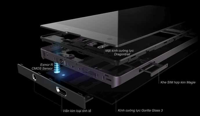 Mặt trước, để bảo vệ và giúp bề mặt cảm ứng hoạt động mượt mà là kính Dragontrail, sản xuất bởi Asahi Glass (thuộc Tập đoàn Mitsubishi). Thương hiệu kính này nổi tiếng với sự mỏng, nhẹ nhưng khả khăng chịu va đập và chống trầy xước cực “đỉnh”. Các sản phẩm đỉnh của Sony dòng Xperia đều có mặt lớp kính này.