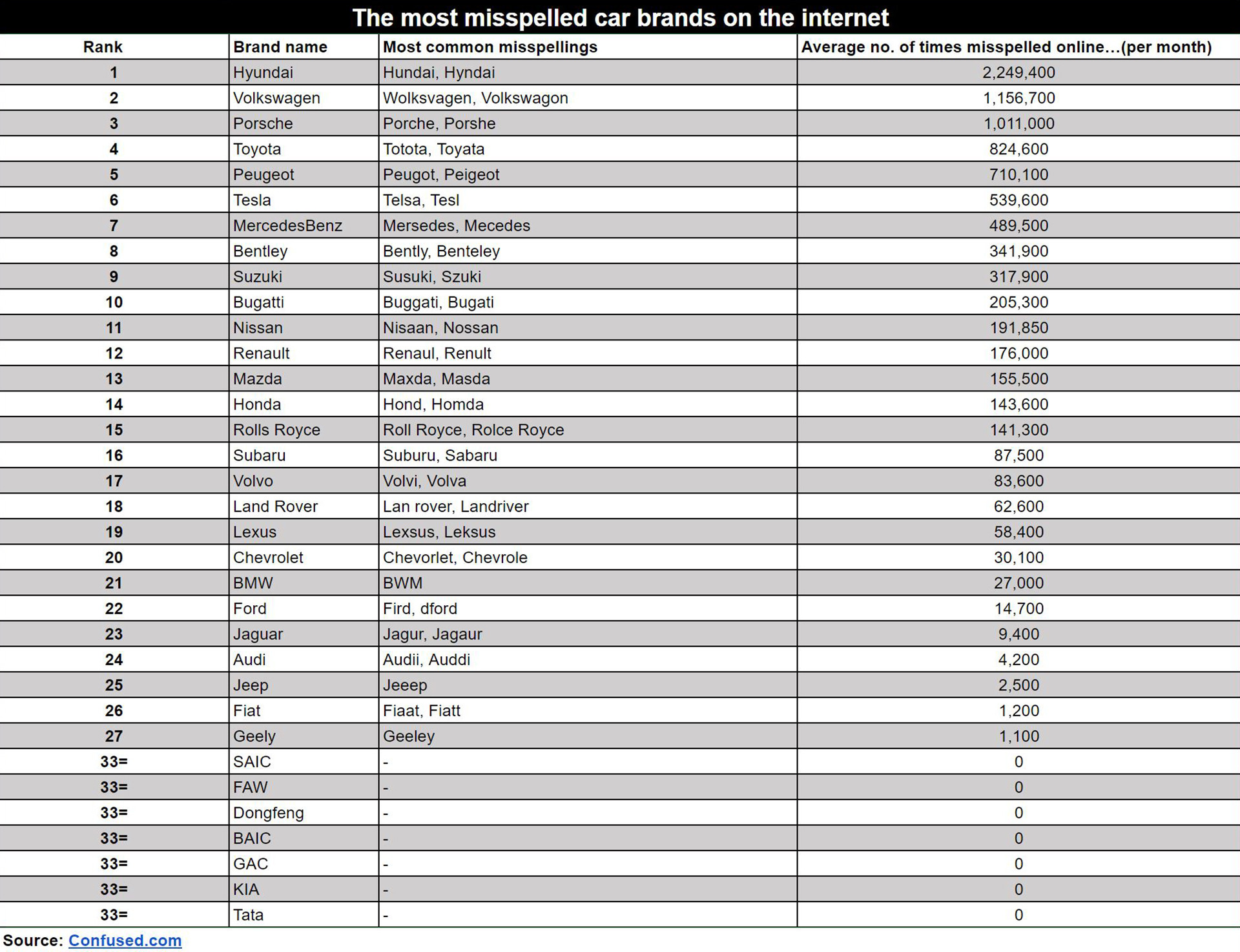 Bốn nhà sản xuất ô tô bị viết tên sai lỗi chính tả nhiều nhất là Hyundai với 2.249.400 lỗi chính tả mỗi tháng; tiếp đó là Volkswagen với 1.156.700 lỗi; Porsche với 1.011.000 lỗi và Toyota với 824.600 lỗi. Lỗi đánh máy sai phổ biến của Hyundai là Hundai hoặc Hyndai; trong khi đó, Volkswagen thường xuyên bị gõ thành Wolksvagen hoặc Volkwagon. Còn thương hiệu Nhật Bản Toyota rất hay bị người dùng viết thành Totota hoặc Toyata.
