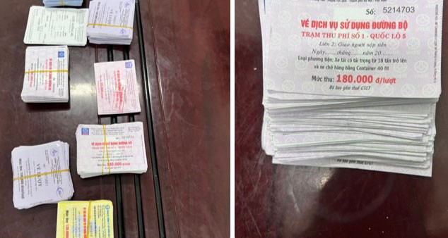 Trước đó, công an bắt quả tang Nguyễn Hồng Quang mang theo người 500 vé dịch vụ cước phí đường bộ giả gồm: 200 vé dịch vụ sử dụng đường bộ trạm thu phí số 1, Quốc lộ 5 mức thu 180.000 đồng/lượt, 200 vé thu giá dịch vụ sử dụng đường bộ Phả Lại, Quốc lộ 18 mức giá 120.000 đồng/lượt, 100 vé lượt trạm thu phí Hoàng Mai mức giá 180.000 đồng/lượt. Tổng giá trị phí đường bộ ghi trên vé là 78 triệu đồng.