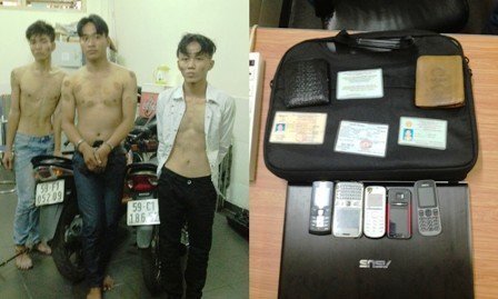 Các đối tượng đã thừa nhận hành vi cướp giật của mình. Ngoài túi xách của nạn nhân T. nói trên có chứa máy tính xách tay (trị giá 24 triệu đồng) thì các trinh sát thu giữ được trong người đối tượng 5 ĐTDĐ các loại và nhiều giấy tờ tùy thân khác.