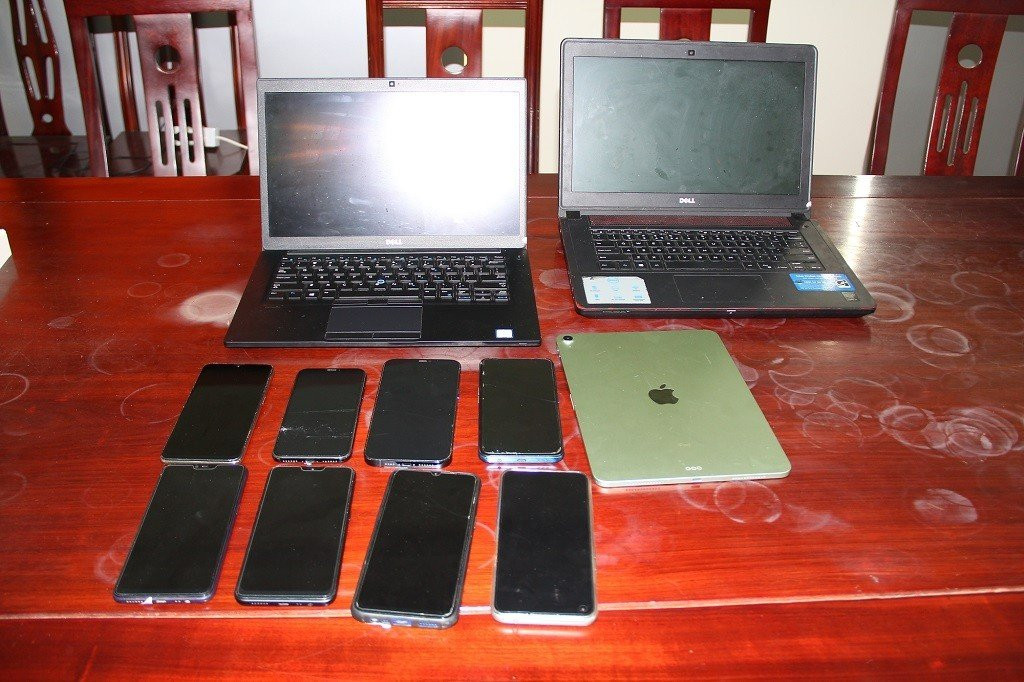 Tang vật chuyên án thu giữ: 8 điện thoại di động, 4 máy tính laptop cùng một số cuốn sổ ghi thông tin lừa đảo số lô, số đề...