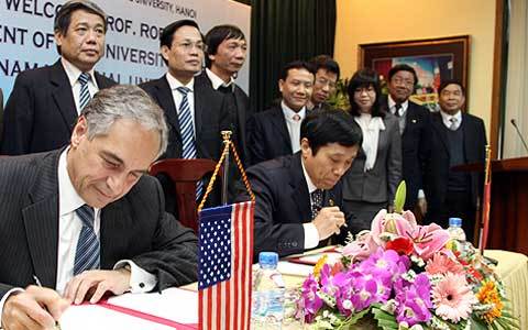 Trong buổi làm việc sáng 8/3, GS Mai Trọng Nhuận, Giám đốc ĐHQG Hà Nội giới thiệu với đối tác, ĐHQG do Chính phủ quản lý trực tiếp, có quyền tự chủ, tự chịu trách nhiệm cao; cũng là ĐH đa ngành, đa lĩnh vực, ĐHQG Hà Nội có nhiều điểm tương đồng với mô hình ĐH của Mỹ.