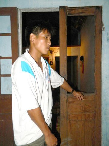 | Đối tượng Phạm Văn Cu chỉ vào cánh cửa nhà em T. bị y tháo. Ảnh: Khả Di. |